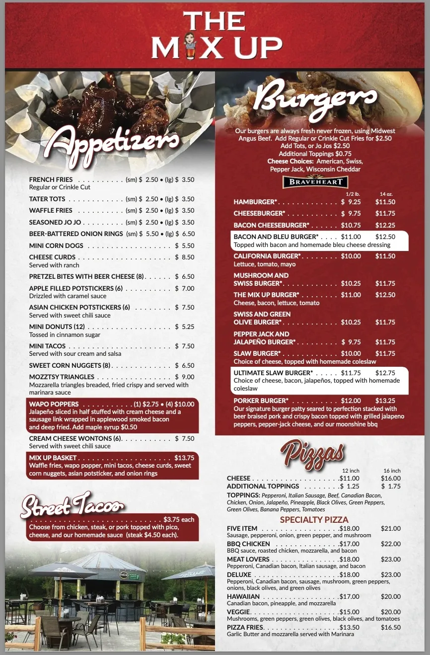 The Mix Up menu brings together bold flavors and classic favorites, featuring satisfying comfort food made to pair perfectly with cold drinks and good company. From shareable starters to hearty mains, every item is crafted for easy enjoyment and laid-back moments.