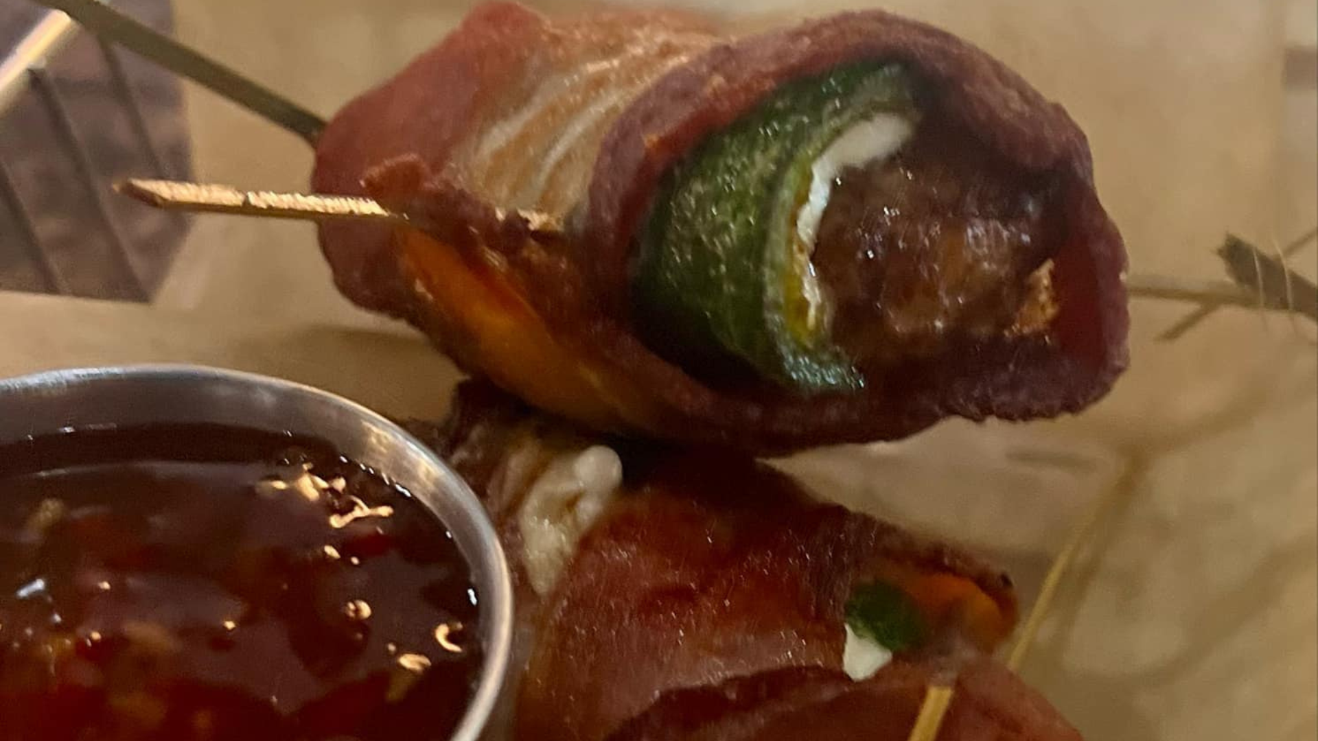Jalapeno sliced in half stuffed with cream cheese and a sausage link wrapped in bacon, then deep fried.